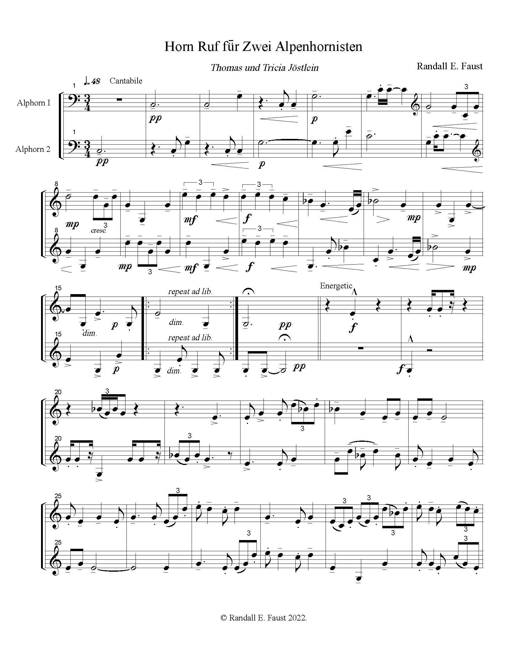 This Horn Call for Two Alphornists has been composed for two dear friends from St. Louis, Missouri, Thomas und Tricia Jöstlein, for a performance at the Missouri Botanical Gardens in St. Louis.